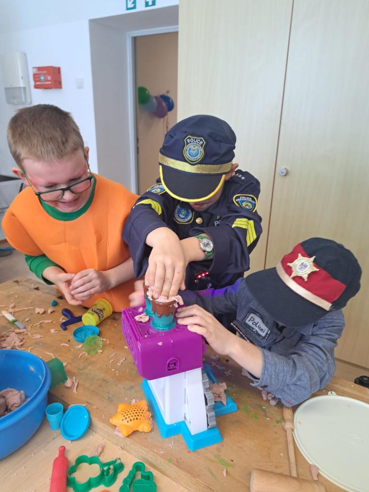 Nach einer leckeren Faschingskrapfenjause startete die Polonaise durchs ganze Haus, zum Kindergarten und schließlich in den Turnsaal. Nach verschiedenen Tanzeinlagen "Macarena", "Gute Laune" und "den Ententanz" wurden die Kinder in Gruppen eingeteilt.